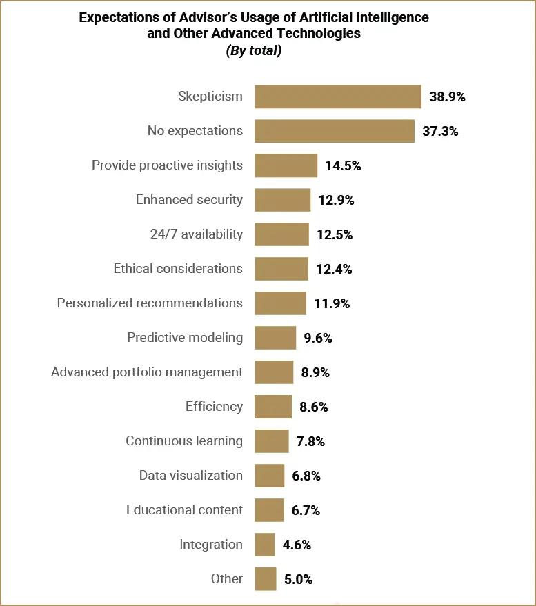 - They remain skeptical. Despite AI’s explosive growth in recent years, affluent investors aren’t so sure it needs to be part of their client experience with advisors. As Exhibit 1 shows, 38.9% of investors are skeptical about advisors using AI and other advanced technologies—and nearly the same percentage have no expectations about their advisors using such tech.